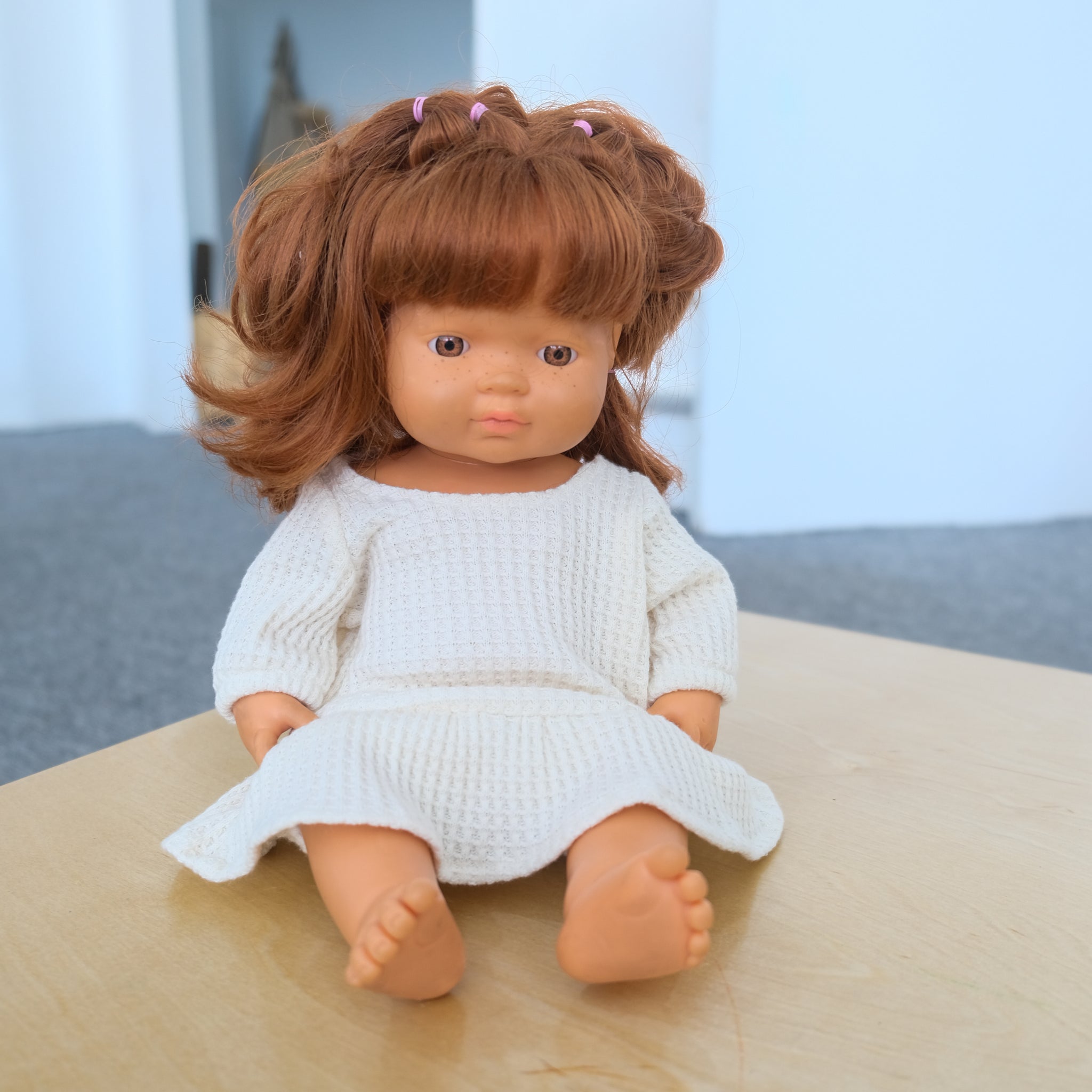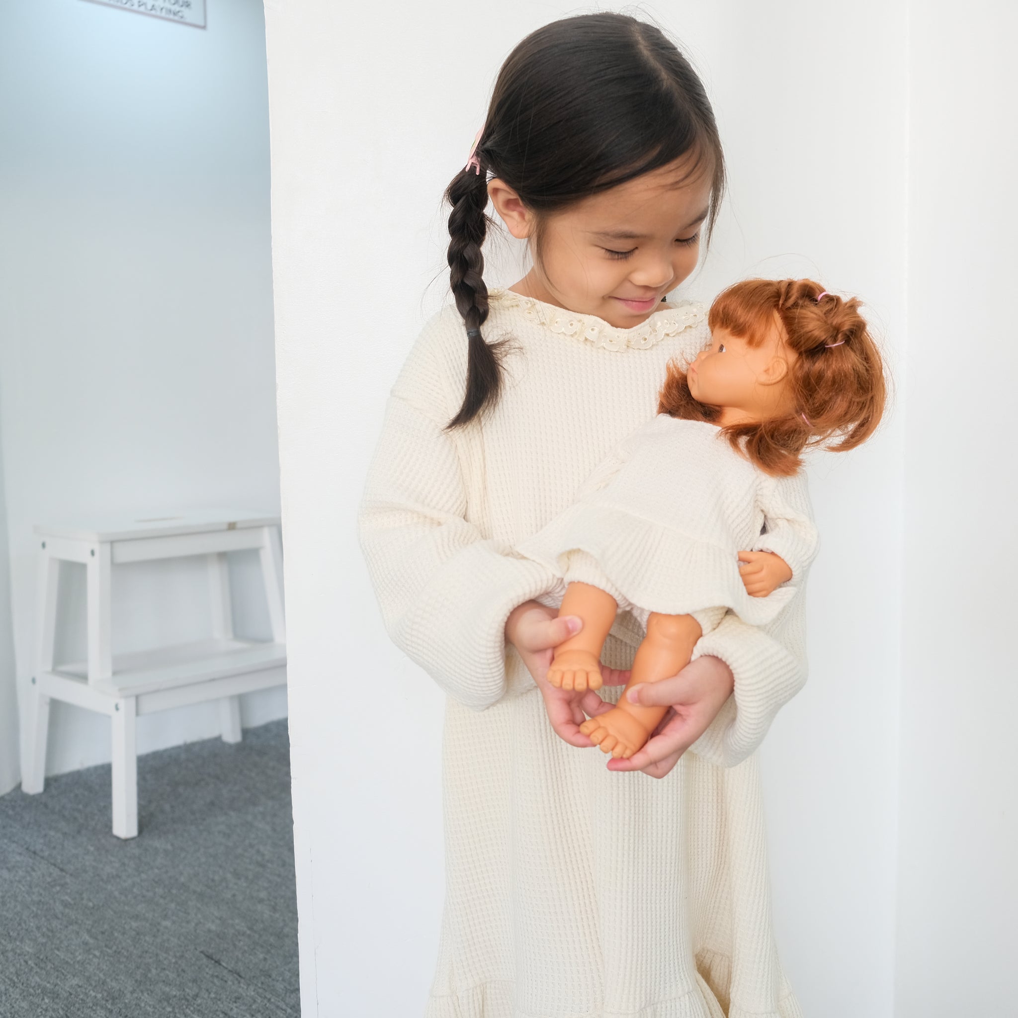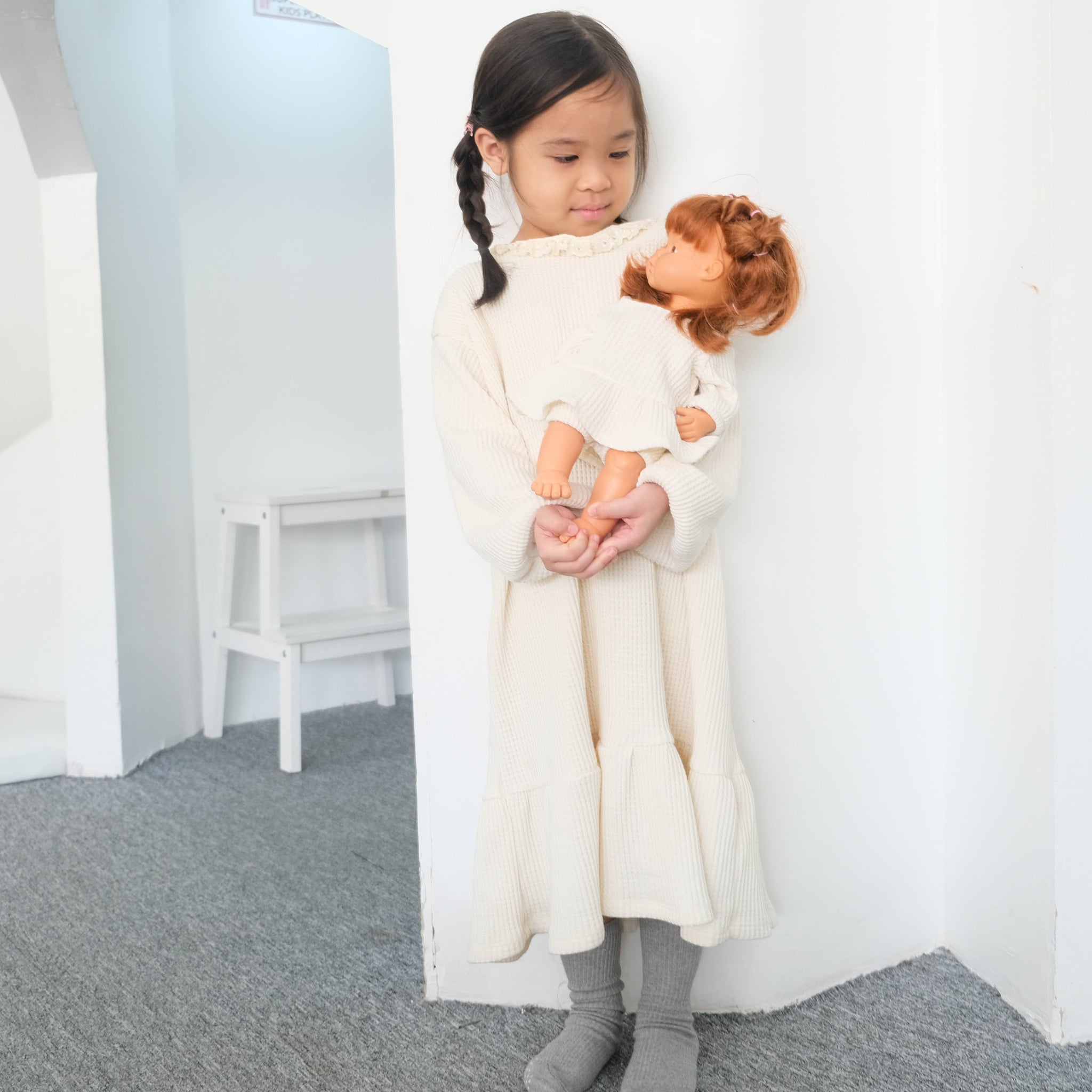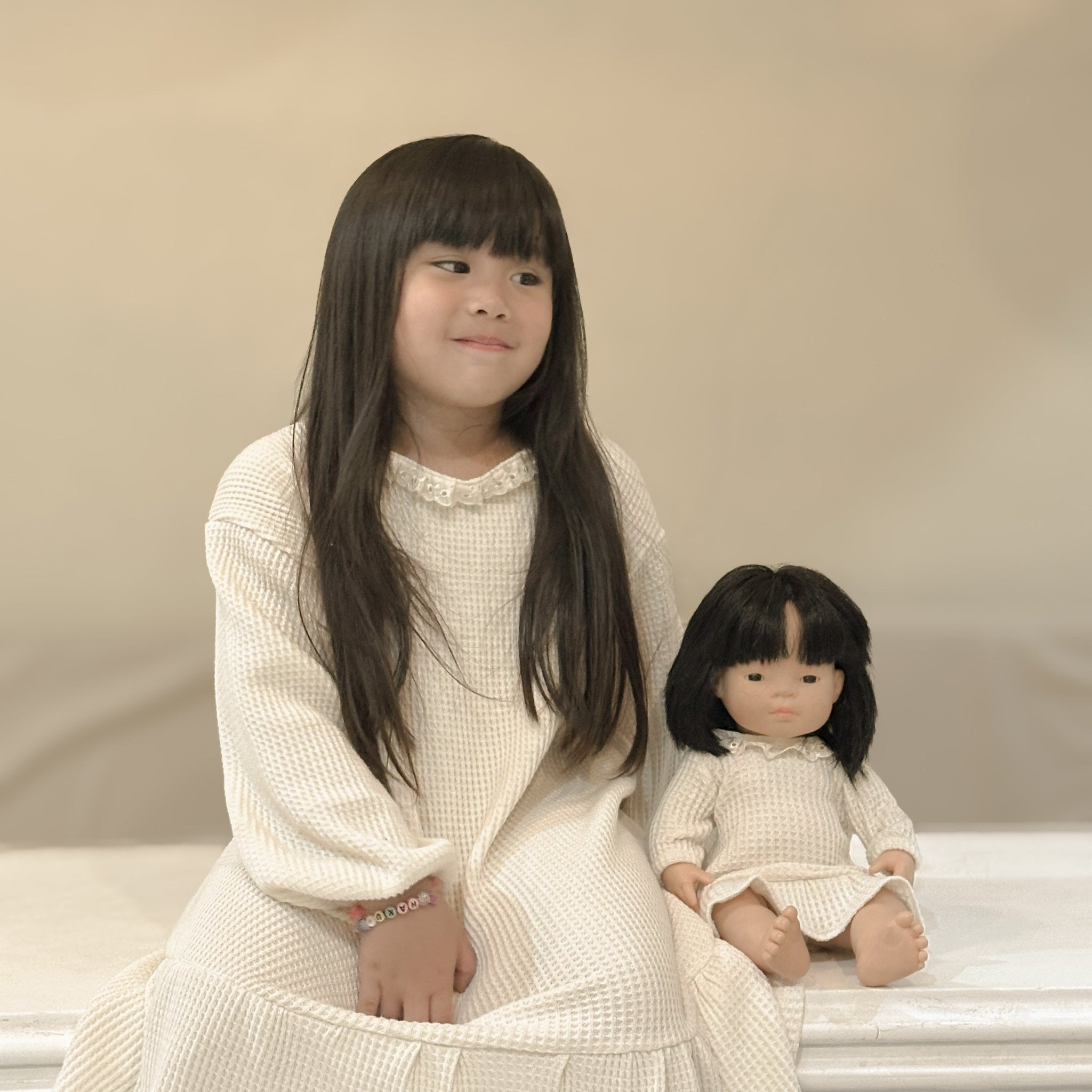 KALARO BULAKLAK Set. A sweet, timeless twinning dress finished with delicate eyelet floral collar details. The BULAKLAK Set brings a touch of softness and tradition, inviting gentle play, care, and connection.